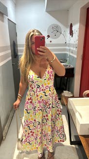 Such a happy dress! The print pops in person, and the fit was super flattering. Loved that the straps adjusted easily, and the linen fabric felt light enough for dancing all night. Paired it with pink heels for a fun, bold look—got so many compliments!