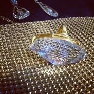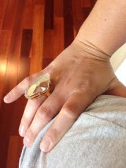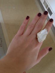 Giant cocktail ring, lovely gold setting, great quality- no green ring-line on my finger. Wore it with Fifth Avenue Showstopper dress and it was perfect!