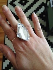 I loved this ring. Pictures really do not do it justice. The stone is large, clear, shimmery and gorgeous. I love statement rings and wear them often, and this one was very comfortable to wear; its relatively light and easy to wear! Its a fun piece, I'd definitely rent it again!