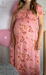This dress is lovely. The shirring on the bodice stops right below your baby bump, and looks very flattering.