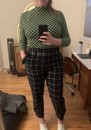 The pattern is fashionable, the fabric is really nice (thin, not too warm), good fit without being skin tight. Not too baggy. Moves well. Comfortable. I wore a leather jacket over it with black jeans & chunky combat boots and then wore it again for work with fake leather culottes. I’m 5’5” 135lb 36A and the M was perfect.
