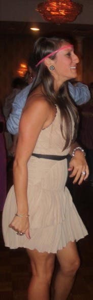 At first, I didn't think this dress was going to cut it. The size 0 was not available, so I was hoping the 2 would work out. It was looser than I would have liked and the front pleats were puffy (I think a larger bust would have fixed that), but I decided no one else would notice. I received plenty of compliments, and it was great having it shipped to our hotel so that I had one less thing to pack. It was very flattering, and a ton of fun on the dance floor!