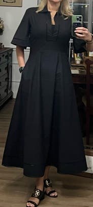 I fell more in love with this dress the more I wore it. The fit was perfect, fitted enough to show curves, but comfortable as hell. Nicely made with quality finishing. A little long, I suppose, but I loved 🥰 it with striped espadrilles and a simple choker. The neckline is low but things stayed in place effortlessly. Lots of compliments. Will rent again.
