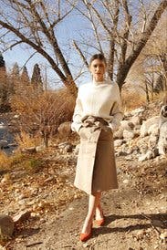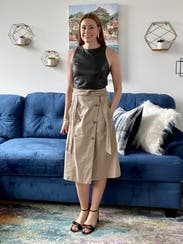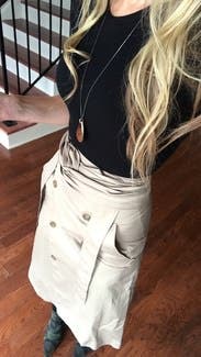 This skirt is an incredibly unique look, sort of like the bottom half of a trench coat. It's got a huge slit up the front of the dress where the two front parts overlap. It's got pockets. And the waist fit perfectly. However this skirt is clearly designed for a woman who has no hips. It also runs super small, so I had to call and swap the original 38 for a 40. I wore it with a silk Joie top and black heels and I definitely felt confident and sexy in it.
