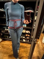 Wonderful turtleneck; I wore it a couple of times and enjoyed it. The contrasting burgundy color, the neck buttons, and the little pouf in the sleeve are all high-quality details that made the look. I didn't love the belt, but it was fine.