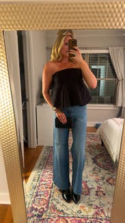 I did size up, but probably didn’t need to, because I needed to wear a padded bra to keep it up. I wore this with long wide leg jeans and heels. So many compliments! Fun for a date night.