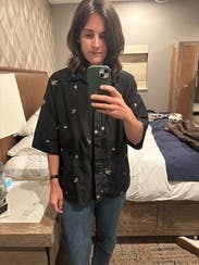 Loved this shirt! Oversized fit and extra long sleeves make the shape interesting and the embroidery adds a nice touch. Fabric is light but doesn’t get wrinkly