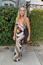 The fit of this dress is perfect. Because it’s a petite, it is super flattering and true to size! The straps are a bit too long but could easily be adjusted for a one-night wear. I’m not a huge fan of the pattern — the triangle detail lands in a weird spot and kind of looks like a bikini bottom — but the overall cut is gorgeous and really flattering. I just wish it came in other colors because I love the fit!