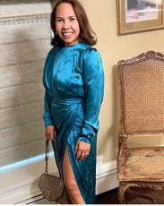 This dress is sexy, classy, and overall amazing. I'm quite short and very petite, so finding clothing that fits me as-is is a miracle in and of itself. Not only did this dress fit, but the cinched waist and angled leg slit made it look like I actually had some (slight) curves! Unfortunately, the weather turned rainy, hot, and muggy, and I didn't want to risk it with a long sleeve silk dress. If I have another chance (and some better weather), I'm renting this dress again - too good to pass up!