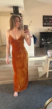 Orange velvet? Who knew?? Fit like a glove, straps aren’t really adjustable to be prepared for a deep V - but you will feel magical. Loved this dress.