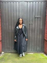 Loved this dress! Dressed it down with a vegan leather jacket and silver Sambas.