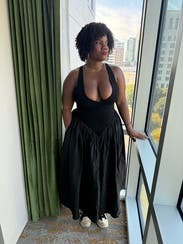 Such a winner. I dressed this down with sneakers and the juxtaposition between the full skirt and casual shoe worked perfectly for the event (a Homecoming day party). It’s definitely low cut but for someone with a smaller chest (I’m a 36 DD), it wouldn’t look quite so daring. I sized down to a medium as suggested and think that was best because the top has significant stretch, and there’s actually a bodysuit to ensure the top half lies flat. Too expensive for me to purchase, but if I’m looking to treat myself, I’d definitely consider this.