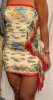 Very cute little tube dress with interesting fabric, ruching, and flowy draping. Loved for a dinner party!