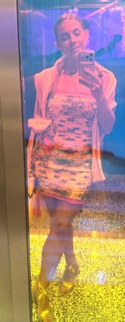 I got so many compliments on this dress! Downside is definitely firm and not stretchy and the sizing isn’t true. I read the others reviews and got a large when I usually wear a small/medium. It fit but was a bit too big in the chest, still very manageable though!