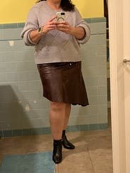 Honestly a little sad to be sending it back! Glad I sized up; it fit super comfortably without being too big. The asymmetrical cut provides a nice point of interest and the color is really lovely - maybe a touch of burgundy in there? Wore it for date night and then work the next day.