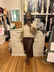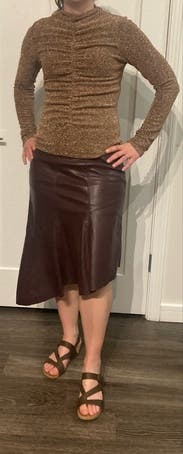 The cut and tailoring on this skirt are stellar! I’d definitely keep this piece and proudly bring it out each year to wear for the fall and winter season. The color is rich, the leather has a nice movement, and the cut softens and highlights curves just right while keeping things modest. I paired it with a chunky pale blue sweater and ivory suede ankle boots; and another time with a glam blouse, fur coat, and cute leather peep toe heels. I definitely got lots of compliments!