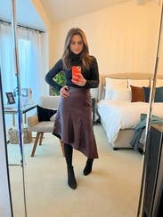 This skirt is very versatile, being easy to dress up or down. It’s extremely comfortable, and the color goes with most anything. I received so many compliments on it, and was confident and comfortable. Fit was perfect, and with the asymmetrical hem, it doesn’t look either too long or too short. I’m sad to have to return it.