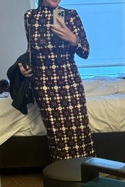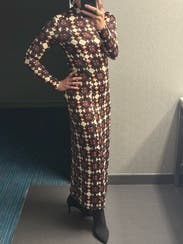 This dress is so comfortable! A nice, stretchy material. I’m only 5’3” and this went all the way to my ankle, but I wore it with booties and it was fine. The small fit perfectly and my measurements are 36-27-37. I received so many compliments. I will definitely rent this again!