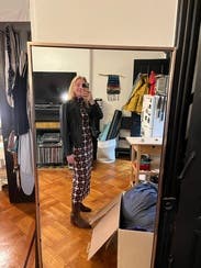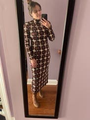 The material surprised me because it was very thin and stretchy, like yoga pants. I thought it would be more substantial. I loved the geometric pattern though and thought the cut and fit were very slimming. I paired it with heeled combat-style boots and a poncho because it was no match for the cold, despite the turtleneck.