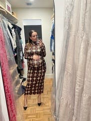 Wore this for my open house. So comfortable while being polished. I am 186 lb, hourglass, and rented the XL. I could have went to a L. I will definitely rent this again for a 3-event day!