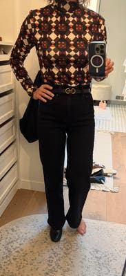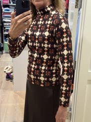 i love the pattern. mock needed more elasticity bc the neck was so loose it honestly ruined the look. the body area was not fitted - fit more like a casual tshirt, so i would’ve gone with a size down.