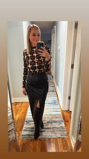 Wore to a rehearsal dinner with black leather skirt. Can be dressed down with jeans and boots too. Fun pattern and so versatile