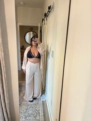 These pants are gorgeous and even more stunning in person when the light hits them. I wore them flying home from Cabo with nude sandals and silver accessories, and got so many compliments. If you like attention, this is it! The bottoms run large. I normally take a large, but they were big through the waist and overall, plus so long that I was tripping on them. I returned them after my vacay to do a medium instead. The fabric is breathable and lightweight but sheer. Fortunately, they are partially lined! The stones aren’t the most comfortable for sitting, but the look is totally worth it. Don’t skip the top because together this set is EVERYTHING! I will be buying! 🙌🏼