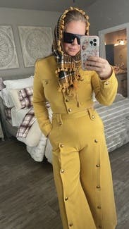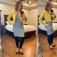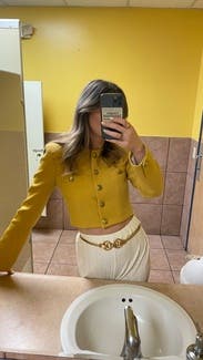 This is a very cute jacket but hit my body right at my hips making me look much wider than I am- I still wore it to work because I needed yellow for my event, but I wouldn’t rent it again.