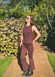 Exactly the funky artistic vibe you would think matches Taos NM perfectly. Had so much fun prancing about in this outfit! Terrific stretchy and high quality material. Pants are cropped so recommend a little heel action