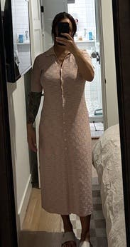 This was a really comfortable and well-made dress. You can tell it’s a high-quality piece. The only downside was that the fabric overlap under the buttons was smaller than I’ve seen on other RTR items, so there was a little gapping when sitting. The fit was relaxed and not super form-fitting, so it didn’t have a ton of shape. Overall, a nice rental for work or casual wear, but not something I’d buy to keep.