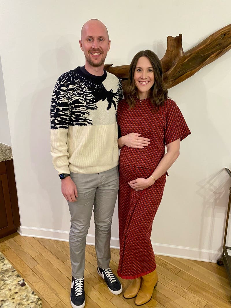 Red printed jersey (85% Viscose, 11% Nylon, 4% Elastic). Skirt. 32" from shoulder to hemline. Made in the USA.