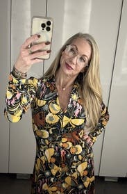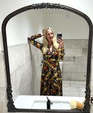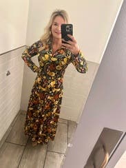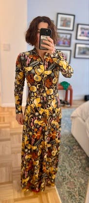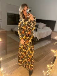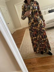 This dress is elegant yet fun, can be dressed up or down. It's bascially like wearing a really long quarter zip in terms of comfort but the print, length, and velvet elevate. I wore with a black waist belt and boots but I could see it also looking great with white boots. I'm an 8-10 in dresses and the L fit me really well. (I'm about 38-30-39)