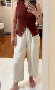 This set is such a dream—I love how versatile it is! The linen vest and matching pants can be easily dressed up or down, and the fit is absolutely perfect. The pants feel effortless and tailored at the same time. The vest does require a little extra care; I found it slightly temperamental when trying to steam out wrinkles, especially around the chest pocket area. But once it’s pressed, the look is chic and elevated. Perfect for everything from casual summer outings to more polished events.