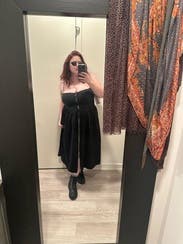 I am absolutely in love with this dress and I will definitely rent again in many different seasons. It's giving sexy witchy phoebe bridgers. There are little draw strings at the very top, right under the bust, and at the waist to make it look sort of like a corset when you cinch it up. The front opens all of the way up with the zipper so you could have a slit from the bottom or even from the top if you want. Will definitely rent again!