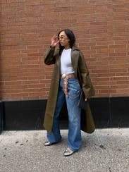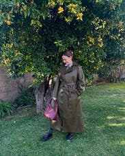The Rosetta Getty x RTR Grommet Belted Faux Leather Trench Coat is a dramatic coat featuring sleek faux leather and a striking grommet-detailed belt for an edgy finish. Layer this commanding piece over all-black separates and tall boots, ensuring the waist is cinched to highlight the silhouette.