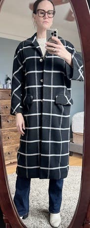 This coat is gorgeous! Love the print and the quality of the wool. Super soft. It’s maybe too long on me but I like the drama. I sized down which is good for me.