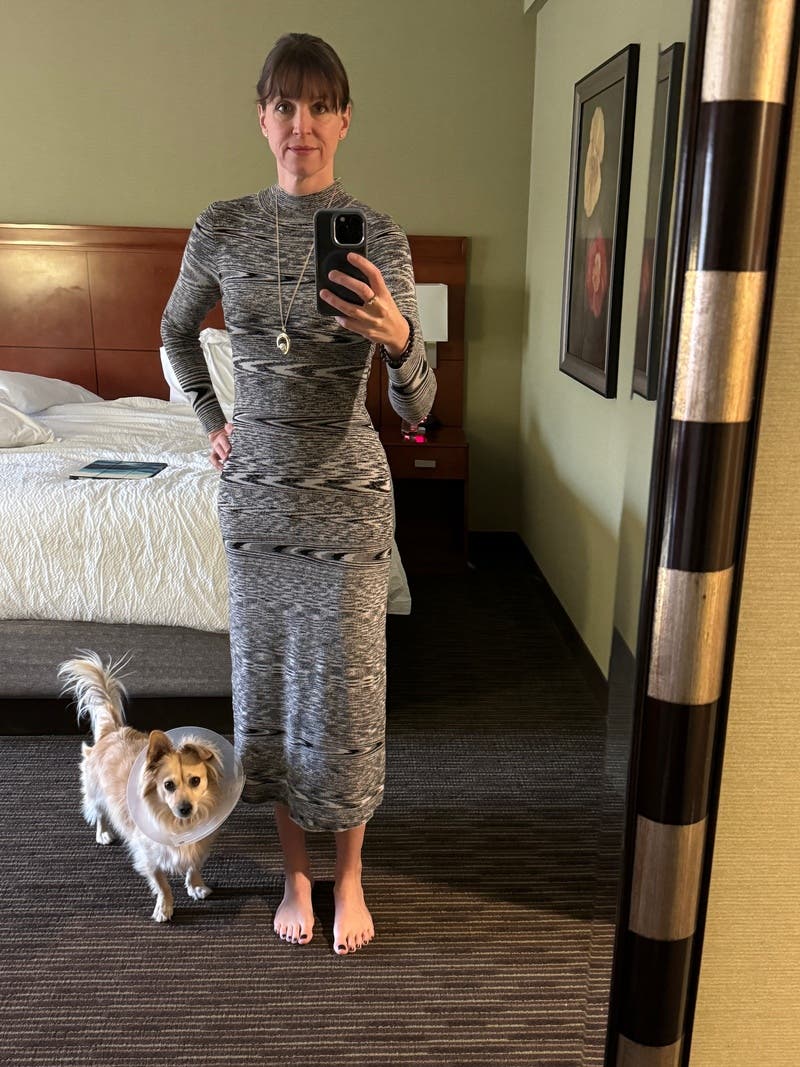 Gray abstract knit (76% Rayon, 24% Recycle polyester). Sheath. Long sleeves. Mock neck. Pull on. 54" from shoulder to hemline. 19" slit. Imported.