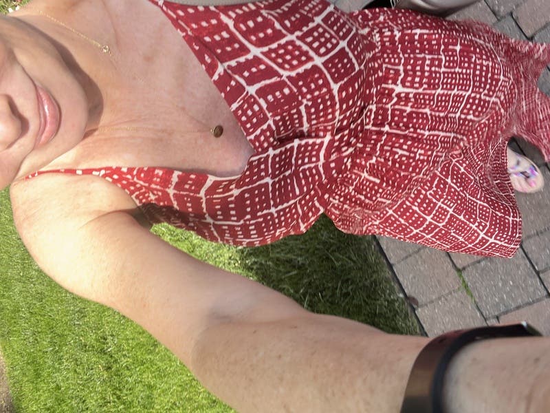 Red printed crepe (58% Viscose, 42% Rayon). Hourglass. Sleeveless. V-neck. Front button closure. 45.5" from shoulder to hemline. Imported.