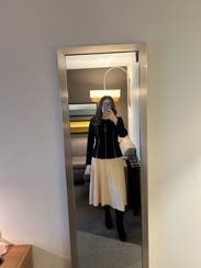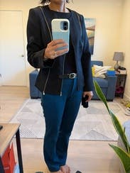 This jacket fits well and elevated jeans for work. I paired it with black jeans and flat riding boots.