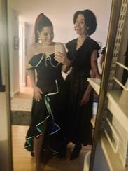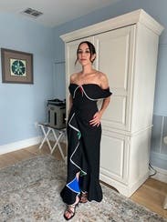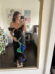 We are obsessed with this sculptural gown by Rosie Assoulin featuring eye-catching pops of color at every ruffle and fold.