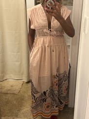 Ended up wearing as a beach cover up, because the neckline had a deeper plunge than expected from the photos and the cut wasn't flattering for an hourglass/pear shape.