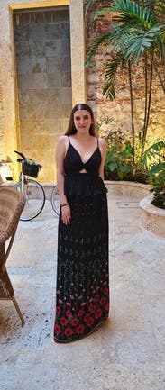Wore this to a quince in the summer. I’m usually a size 10/12 and this fit me perfectly! I will say that the dress is a pretty long (even though I’m 5’7” & wore 3in heels) it still touched the floor. Had to pull some of the fabric up in the peplum area & tuck it into my breast covering the opening/hole in the center of the dress so it wouldn’t drag or trip me (don’t think my changes were that noticeable). I’m a 36C, did not wear a bra, didn’t feel like I needed one, and fit the girls just right. A festive & lightweight dress perfect for any summer/spring formal activity.