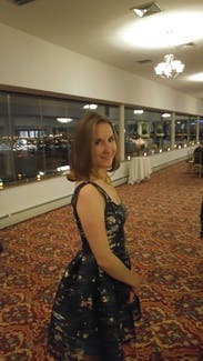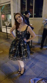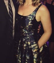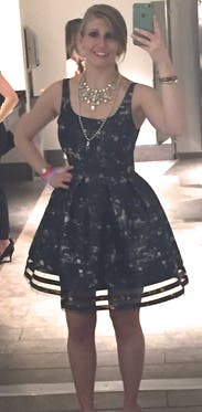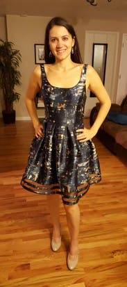 The skirt was poofier than I was expecting, but it made for a really fun silhouette and the coloring/pattern set it apart from the dresses other guests were wearing. The detailing at the bottom of the skirt adds a nice extra touch, but it was a bit scratchy (only an issue while sitting, though.) I have a small chest, so definitely needed to wear a bra - but the material was heavy enough & fitted well, so as long as you filled it out you probably wouldn't need to wear one. Love having pockets - especially ones that don't ruin the line of the dress when you use them (these were deep enough to carry my phone all night). I paired it with the Ben-Amun Chain Reaction necklace from RTR and a pair of dark red heels ... don't have a picture that actually does it justice, but I loved how it all came together & was getting compliments all night long!