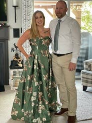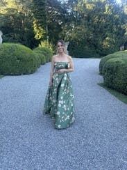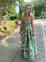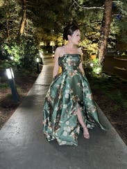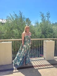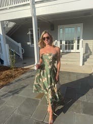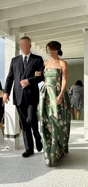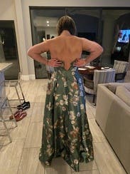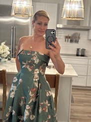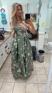 Such a beautiful dress for any formal occasion. The green and florals are perfect for fall. The bust is snug but helps it stay up since it’s strapless. Recommend sizing up.