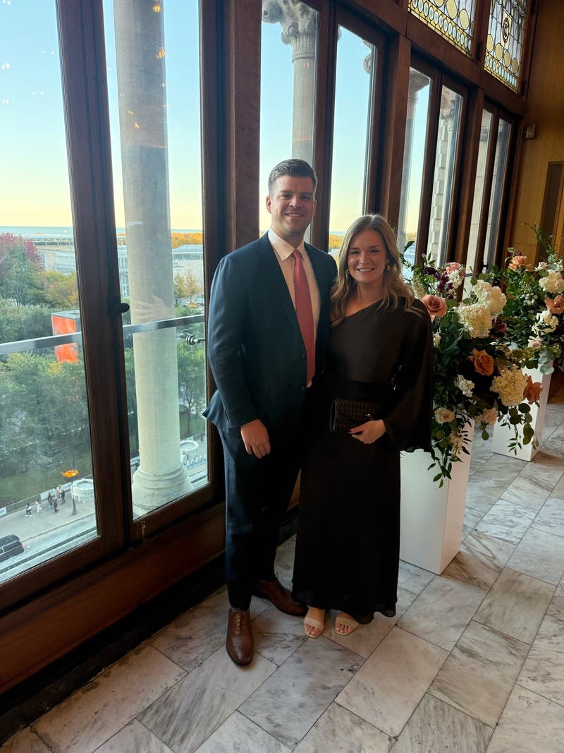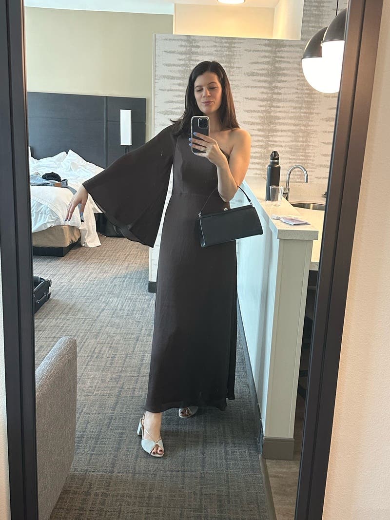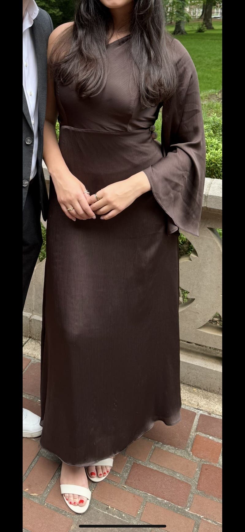A Sachin & Babi one-shoulder gown radiates elegance with its flowing silhouette and dramatic single sleeve. The rich brown hue adds a touch of sophistication. Pair with strappy heels and a minimalist clutch for a refined ensemble.