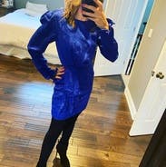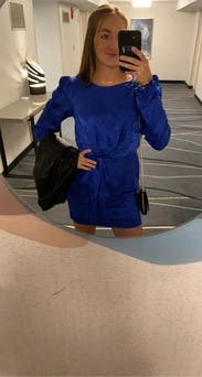 i could not pass up this dress for a fancy work event i had. it is the most gorgeous indigo color with a satin-y finish. even though it is long sleeve, the sleeves are very thin which helps the fabric be a little more breathable. the length is perfect as i'm fairly short. hands down the most perfect dress for someone who loves jewel tones and wants to stand out at your next event.