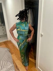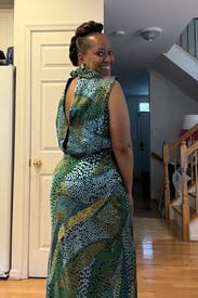 The gown has a striking, unusual design with its high neckline and open back, which makes it stand out. Fit can be a little tricky - the waist runs small, so I sized up to an 8, but then there was extra room in the bust. The regular length also came up a bit short for me. Overall, a distinctive style, but fit and comfort may vary depending on body type.
