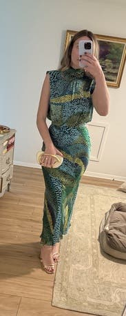 Gorgeous dress that I wore to a formal fundraising gala. Stretchy comfy material. Got tons of compliments. Be cautious with sizing, the waist has no stretch and runs small, hips have stretch but also run small. Top half is forgiving in size. I am athletic build (broad shoulders) and the top was totally fine. Normally size 25 waist in jeans and the 4R was perfect in waist, could not have gone smaller. Also runs short, but the regular length was great on my 5’4” frame. Loved it , would rent again!