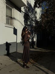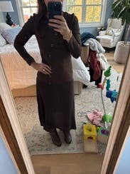 Leaning in to the trendiness of brown here. Overall this dress was a nice fit and easy to wear. It’s true the bottom is slightly see through, but not really noticeable. I would not wear it to work but I felt comfortable wearing it to a dinner party. Good length for petite. I leaned all the way into the brown trend with brown boots, but would be nice with heels too.