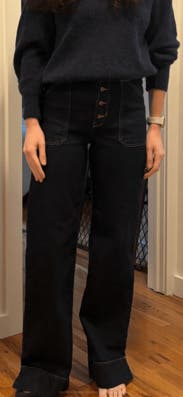 Fine dark jeans, definitely work well for the taller girls. At first I saw the other reviews about buttons and was like I can handle button up jeans, but these were the kind of buttons you'd find on a sweater and they were ok to get on, but they clashed with any top or cardigan that also had buttons. Material stretches out a bit wish I had sized down. All in all they're fine